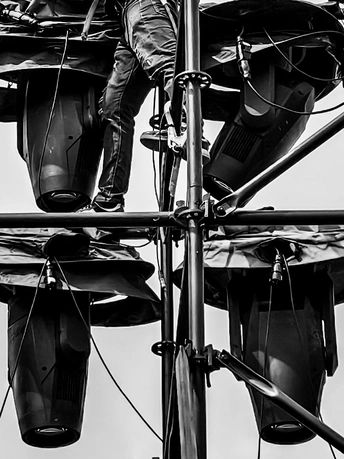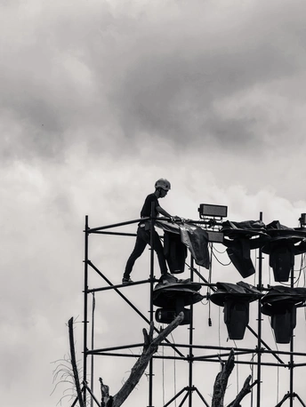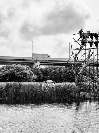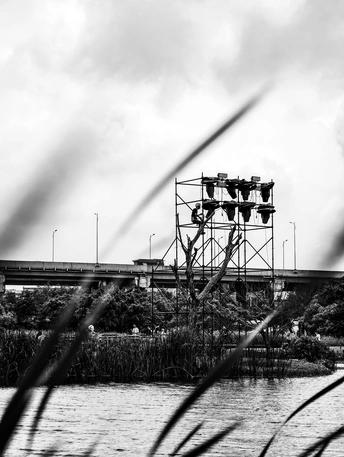 黑白滤镜滤去了喧嚣,却滤不掉生活的两种模样。脚手架上,是工人悬在半空的专注与汗水;芦苇丛间,是路人躲在伞下的松弛与闲谈。高架桥上车流不息,水面波光粼粼,一边是为舞台搭起光,一边是在日常里乘凉。同一片天空下,有人忙碌工作,有人安然驻足,每一种认真生活的姿态,都在黑白里被定格。