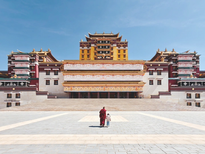稚手牵红袍,心灯映古刹。