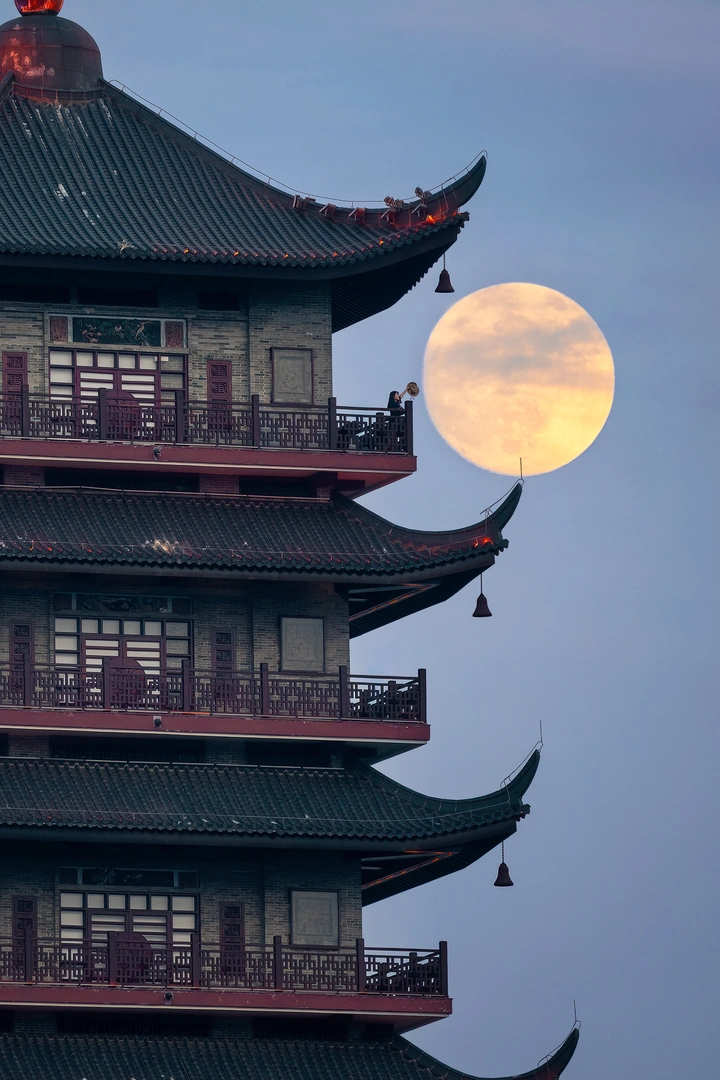 谁立琼楼邀月明?清风铃响伴倩影。
