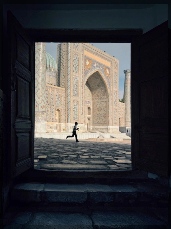 推开这扇木门,千年的风扑面而来。 琉璃穹顶在阳光下流转,古老的经文在砖缝里低语。 一个少年从广场上跑过, 他的脚步,是撒马尔罕从未停下的心跳。