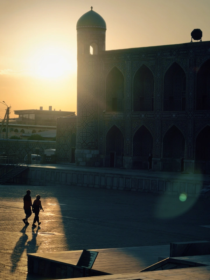 当最后一缕金辉吻过穹顶, 雷吉斯坦的喧嚣,都沉进了黄昏的温柔里。 两个身影踏过余晖, 把千年的故事,走成了此刻的日常。